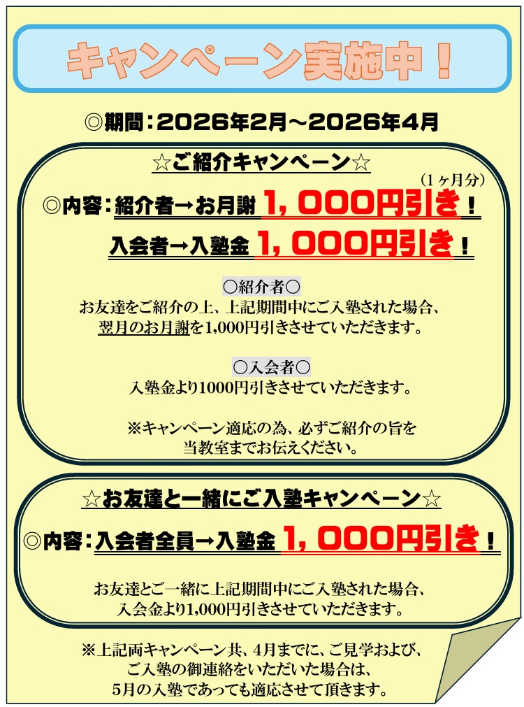 遠方にお住まいの方や、台風等で徒歩通塾が極めて困難である等、